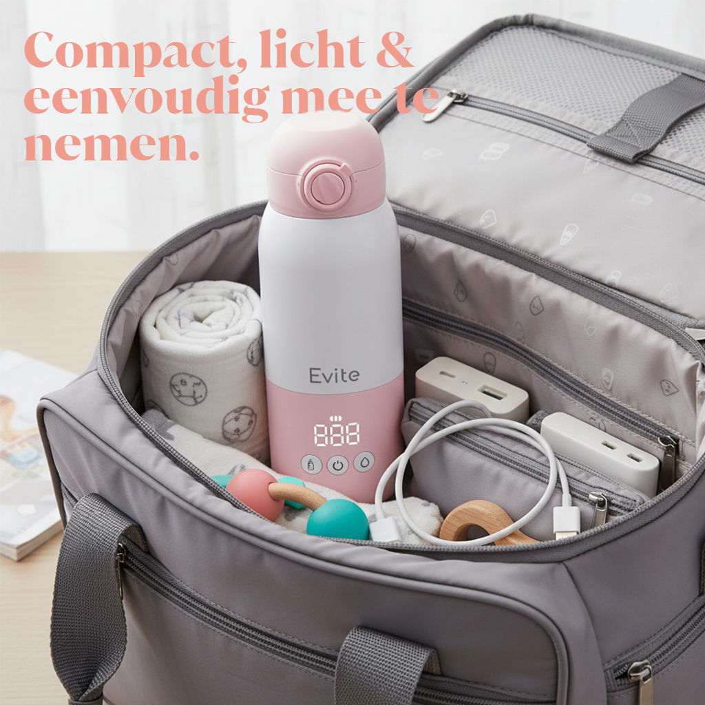 Als ouder onderweg wil je snel en veilig een flesje kunnen opwarmen, zonder gedoe. De Evite Draagbare Flessenwarmer biedt de perfecte oplossing: een krachtige, compacte en gebruiksvriendelijke flessenwarmer die je altijd bij de hand hebt.