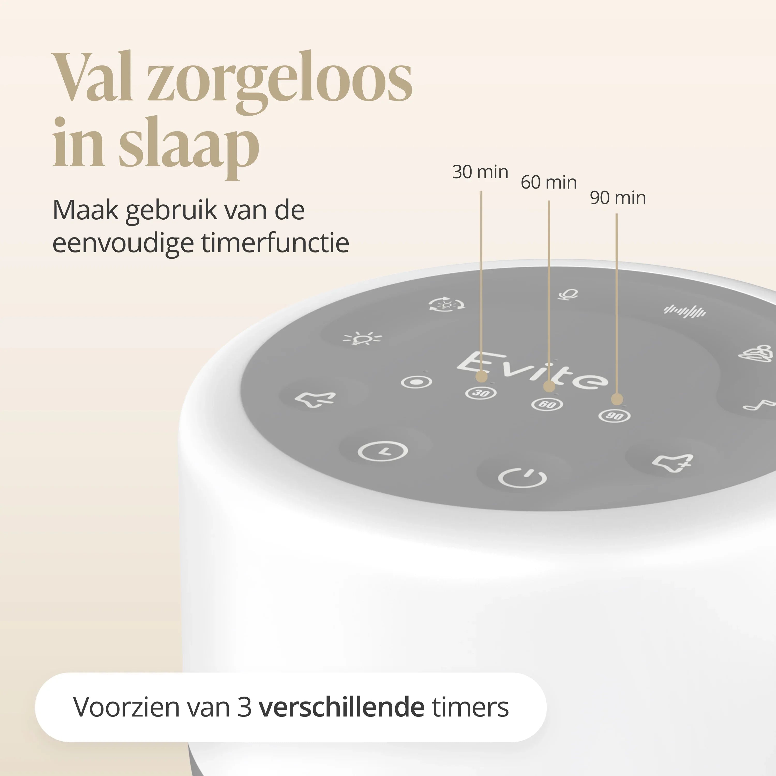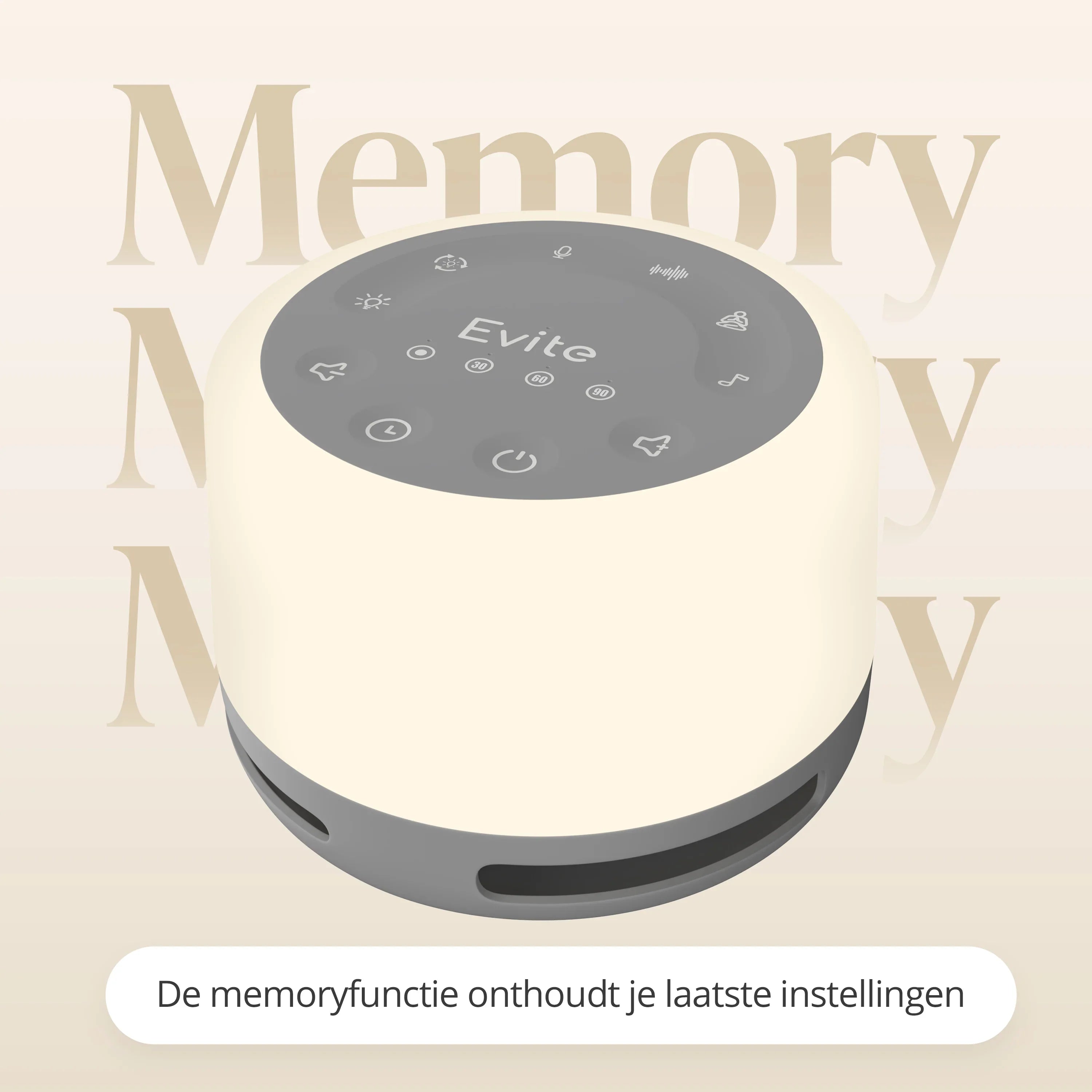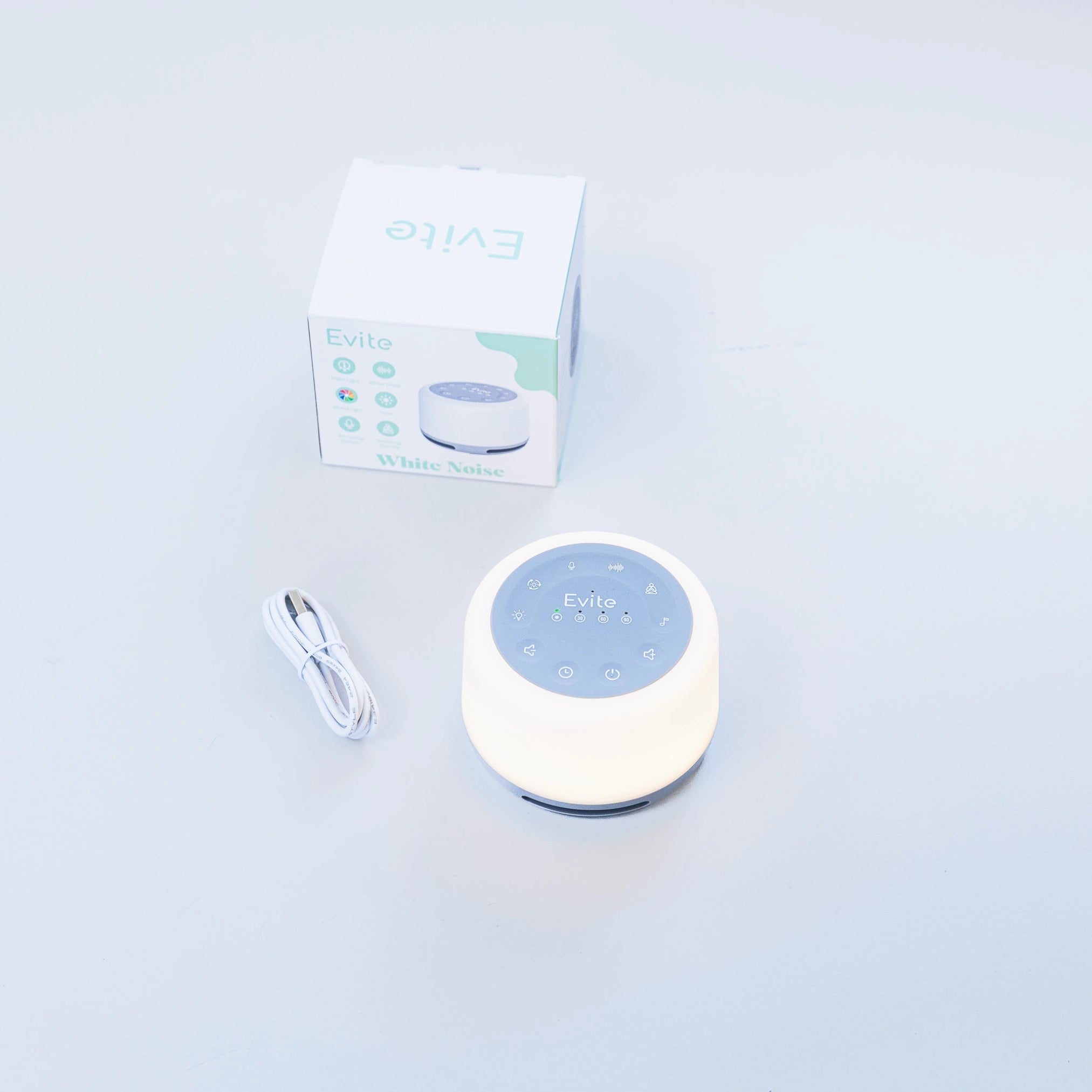De Evite White Noise Machine helpt baby’s (en ouders) sneller in slaap te vallen met 30 rustgevende geluiden. Het compacte, draadloze ontwerp met oplaadbare batterij en sfeervol nachtlampje maakt het de ideale slaaphulp voor thuis én onderweg, zonder apps of wifi.