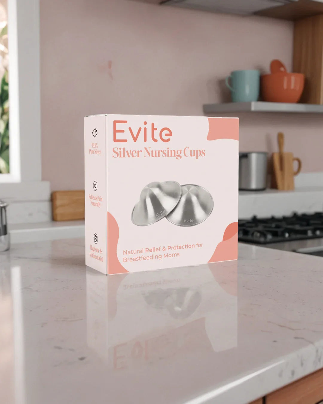 De Evite Silver Nursing Cups zijn gemaakt van 999-zilver en zorgen voor directe verzachting bij pijnlijke, gevoelige of gebarsten tepels. Ze bevorderen het herstel op een natuurlijke manier, zonder crèmes of zalf. Comfortabel om te dragen, makkelijk schoon te maken en stijlvol verpakt. Een must-have voor elke kolvende of borstvoedende moeder.