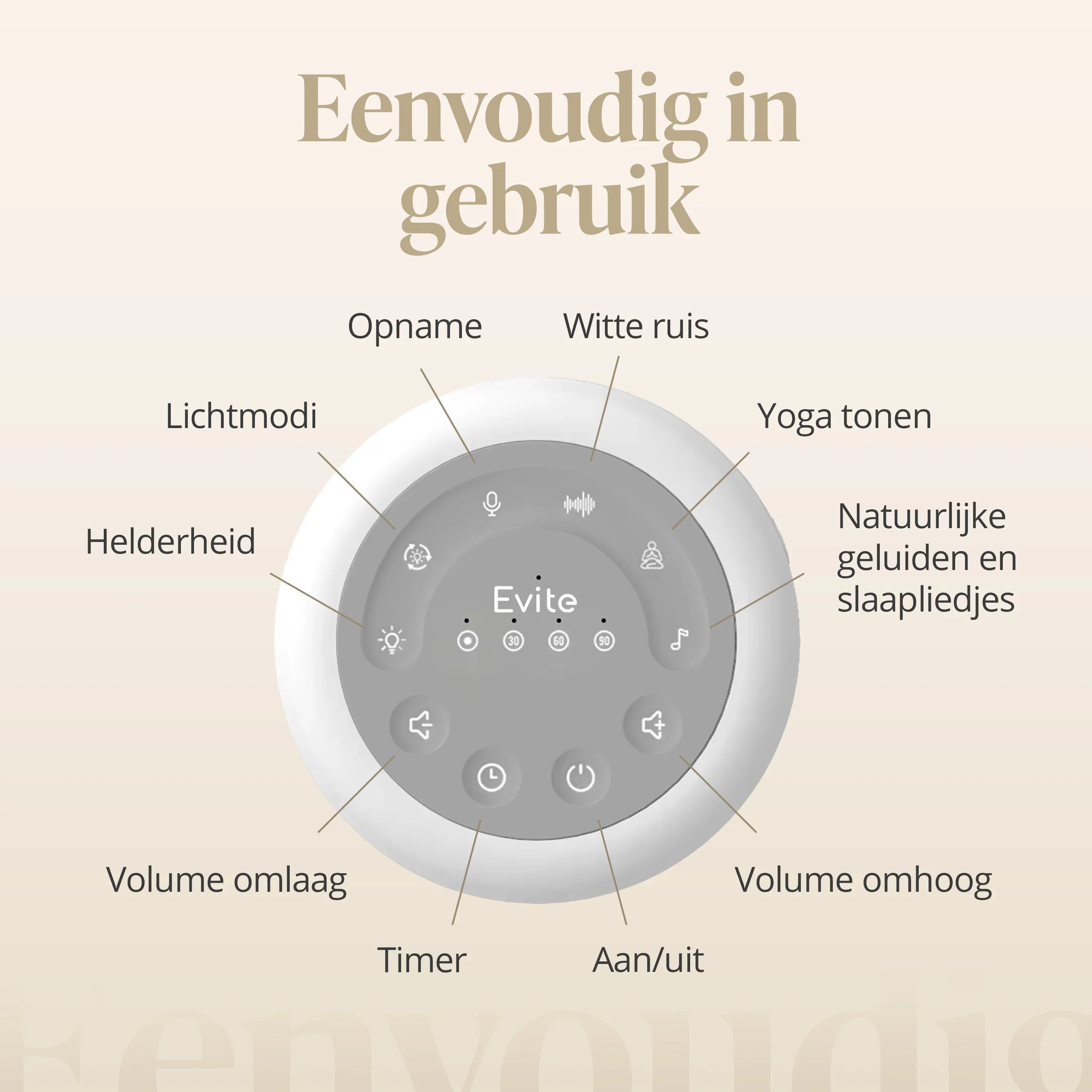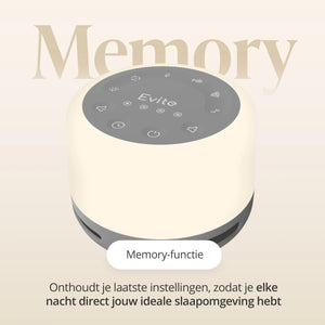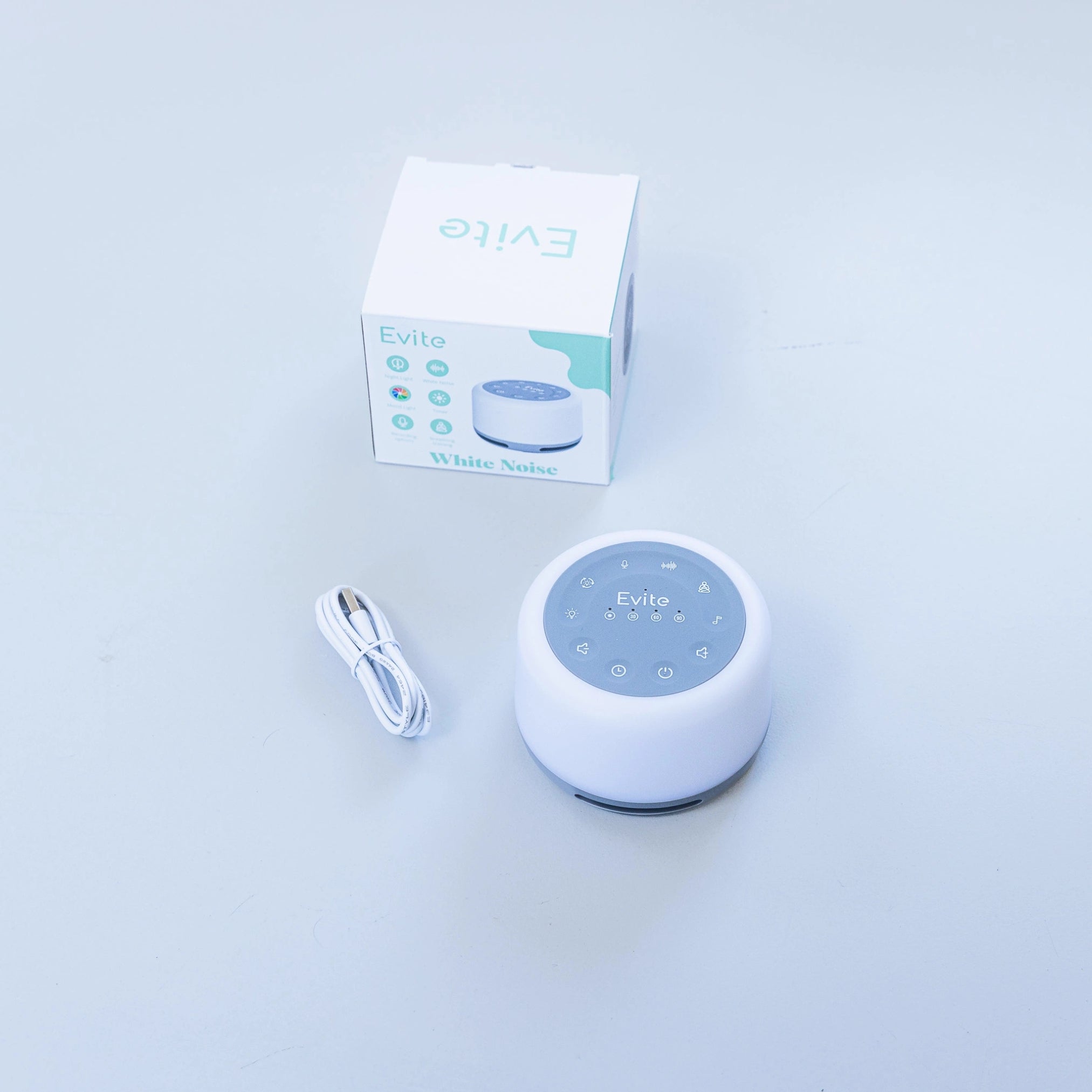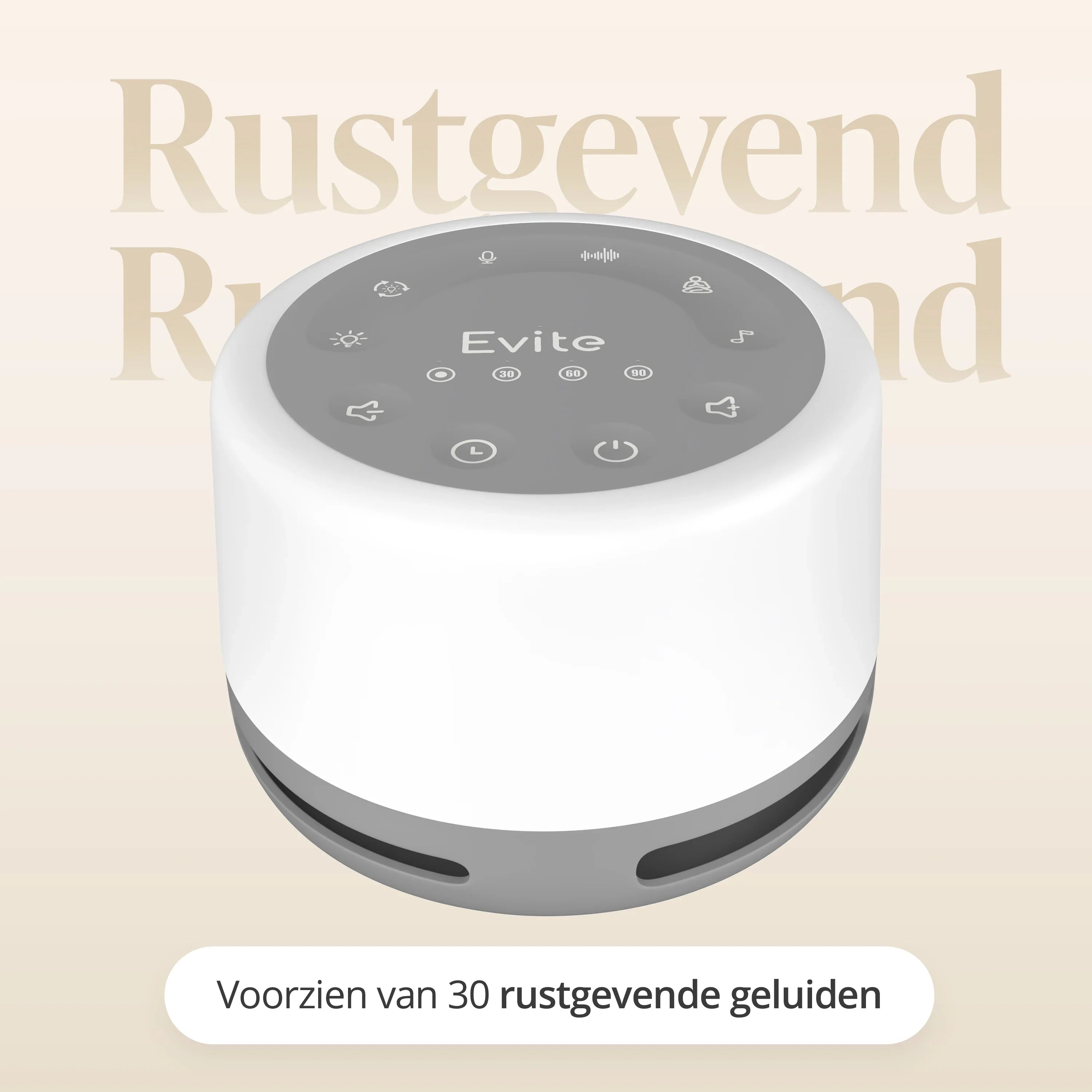 De Evite White Noise Machine helpt baby’s (en ouders) sneller in slaap te vallen met 30 rustgevende geluiden. Het compacte, draadloze ontwerp met oplaadbare batterij en sfeervol nachtlampje maakt het de ideale slaaphulp voor thuis én onderweg, zonder apps of wifi.